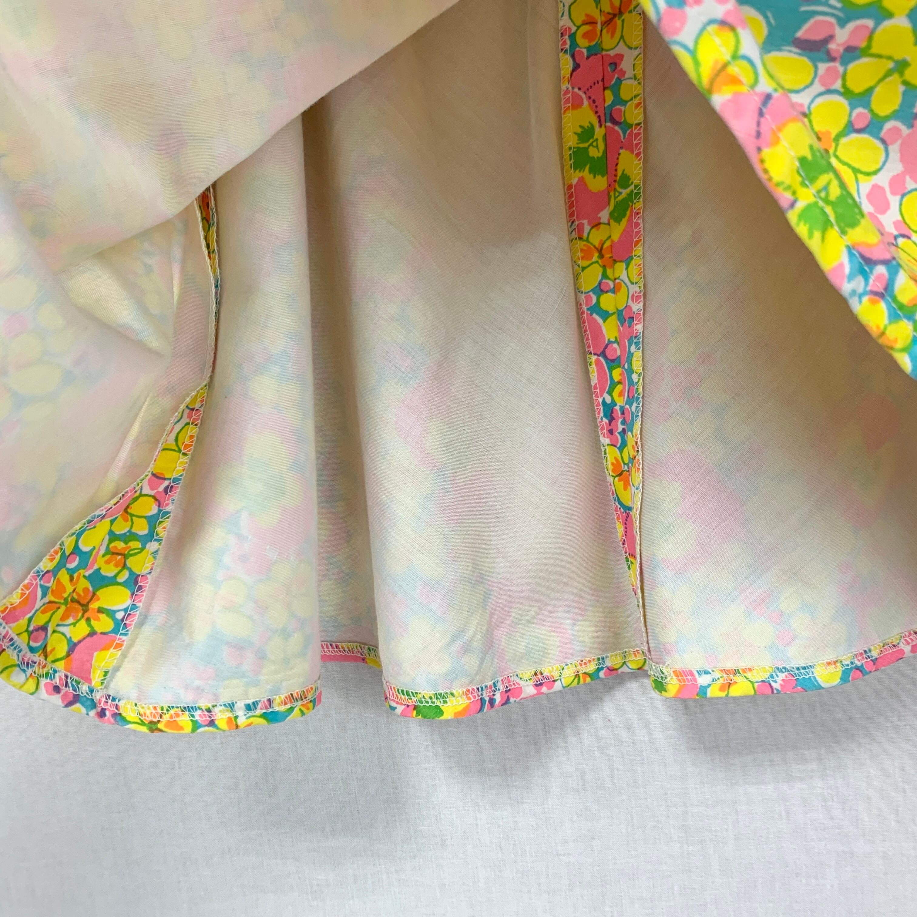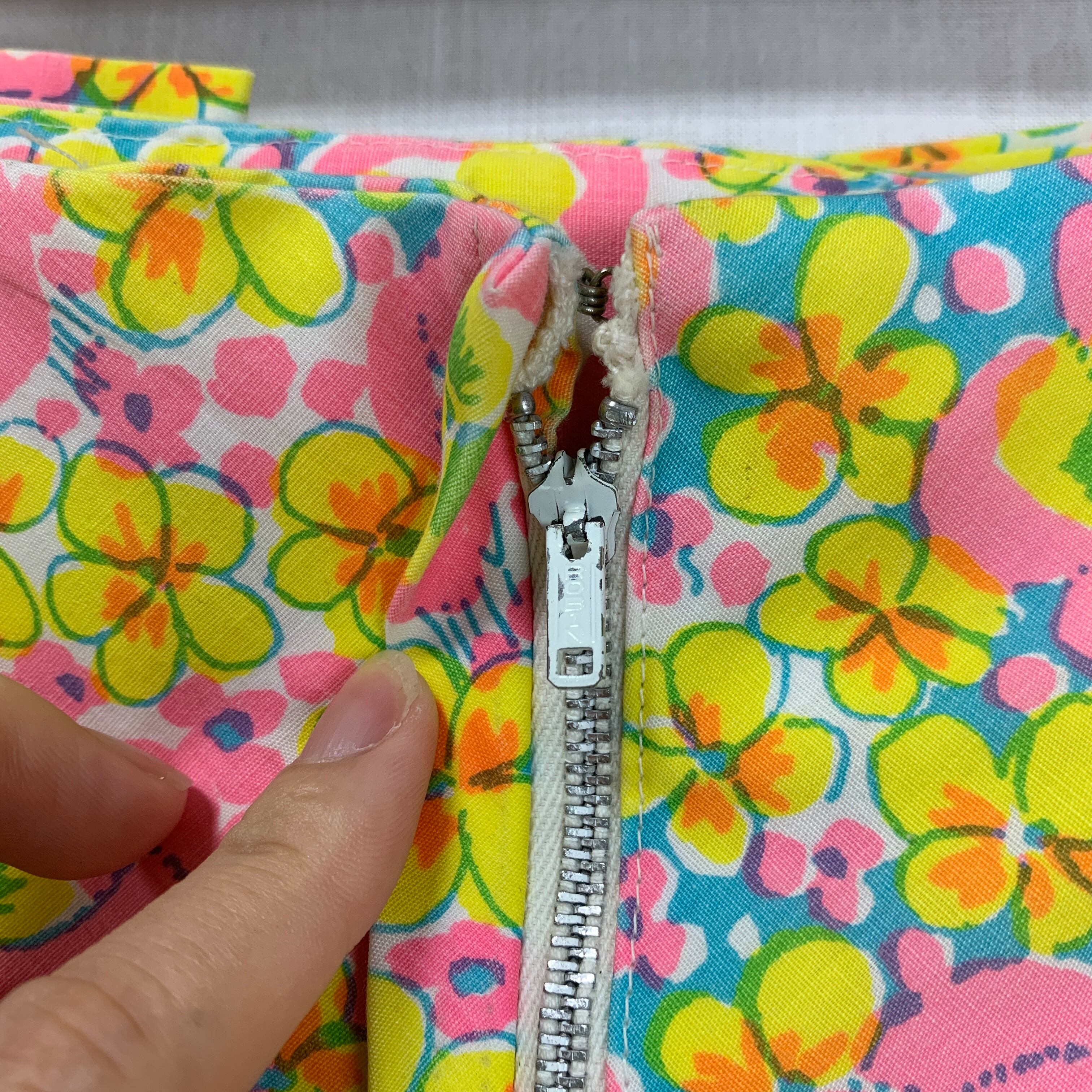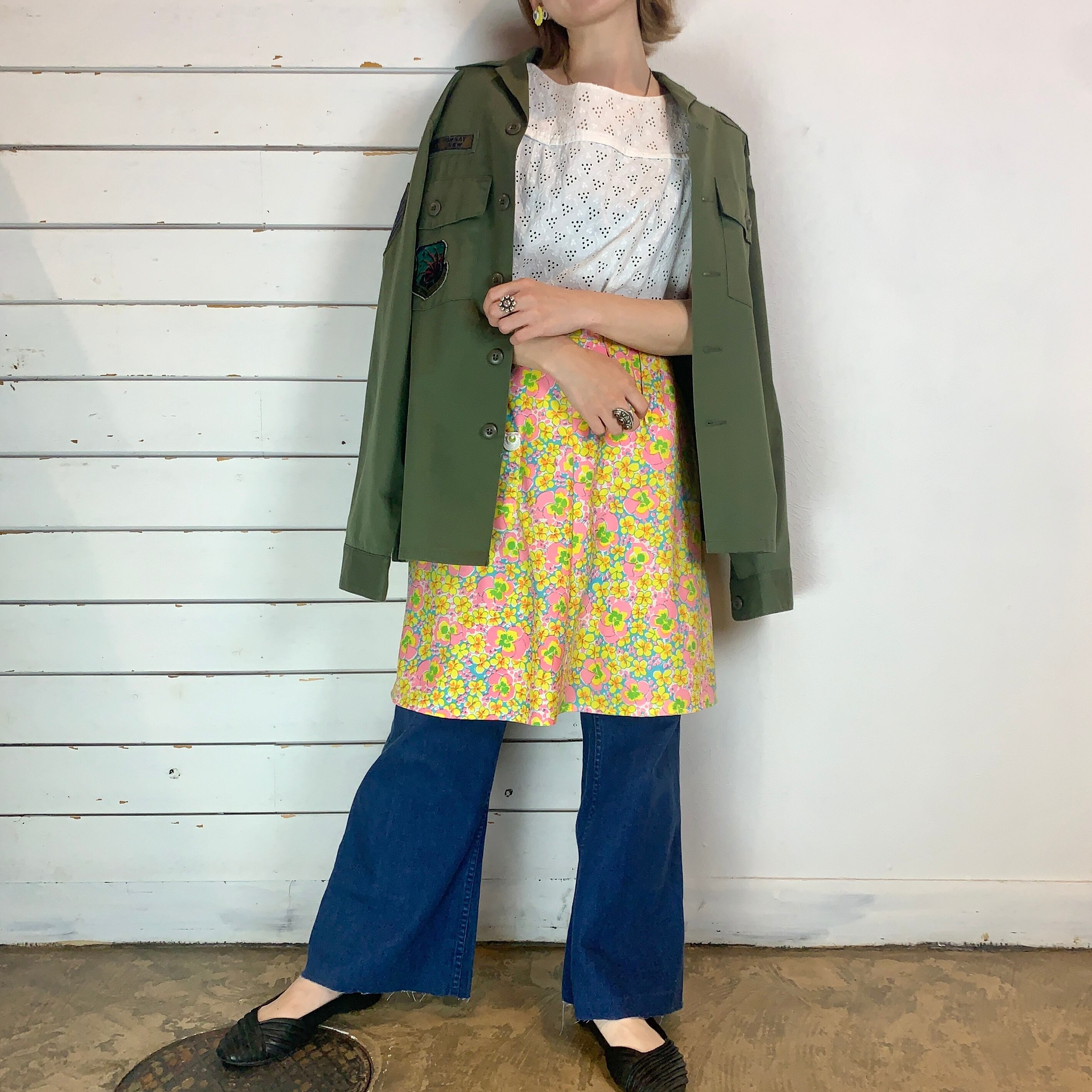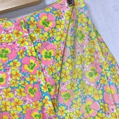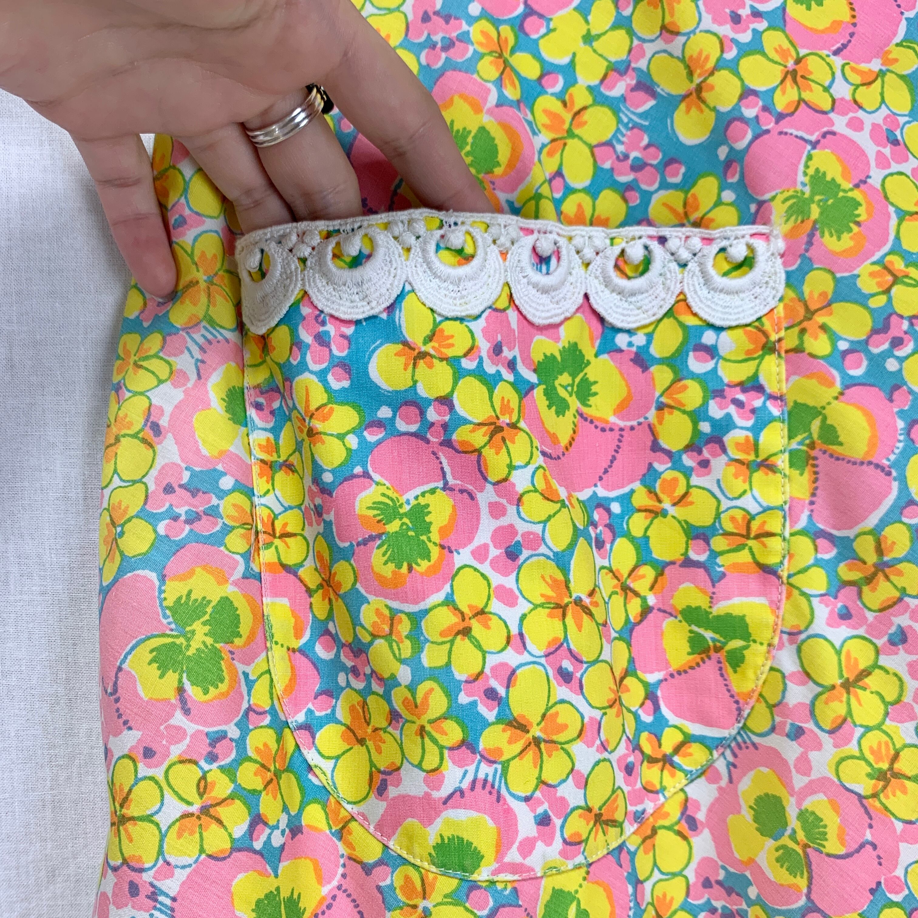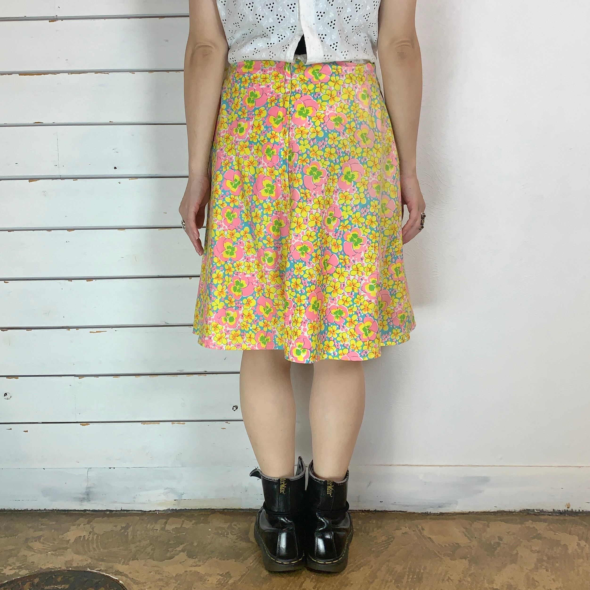 レトロな花柄にレース付きのポケット、ウエストにはリボンとかわいいが詰まったミディアムスカート