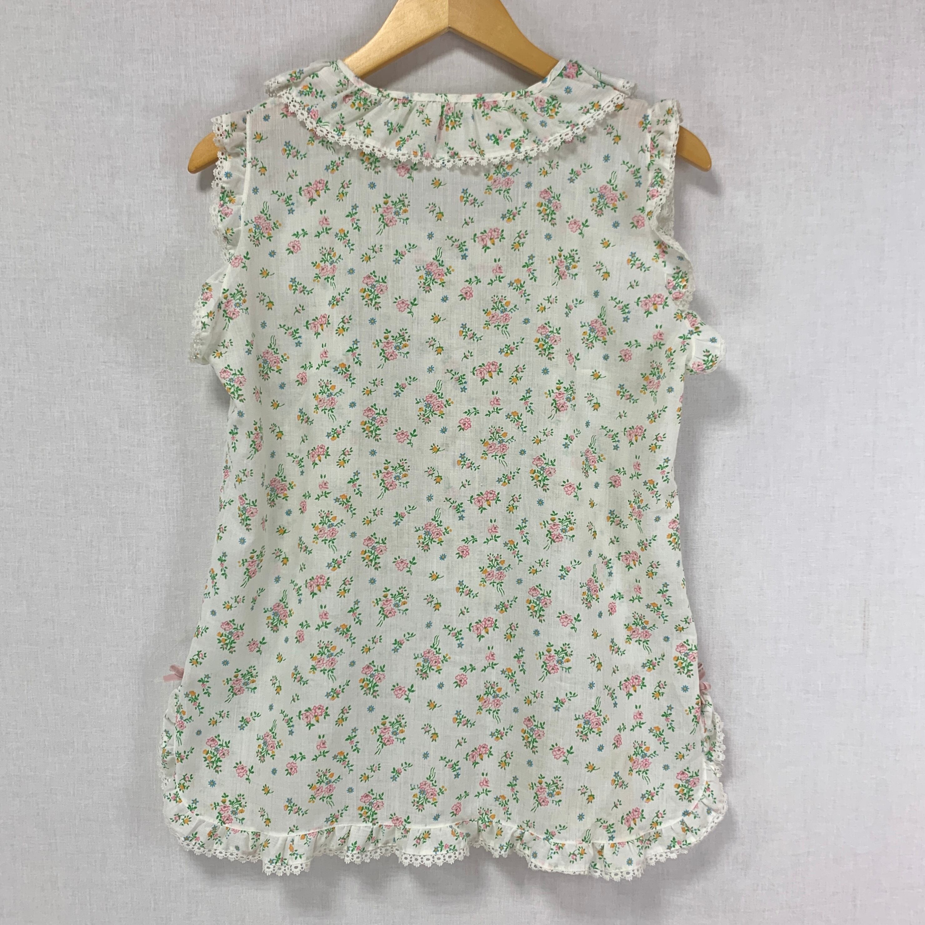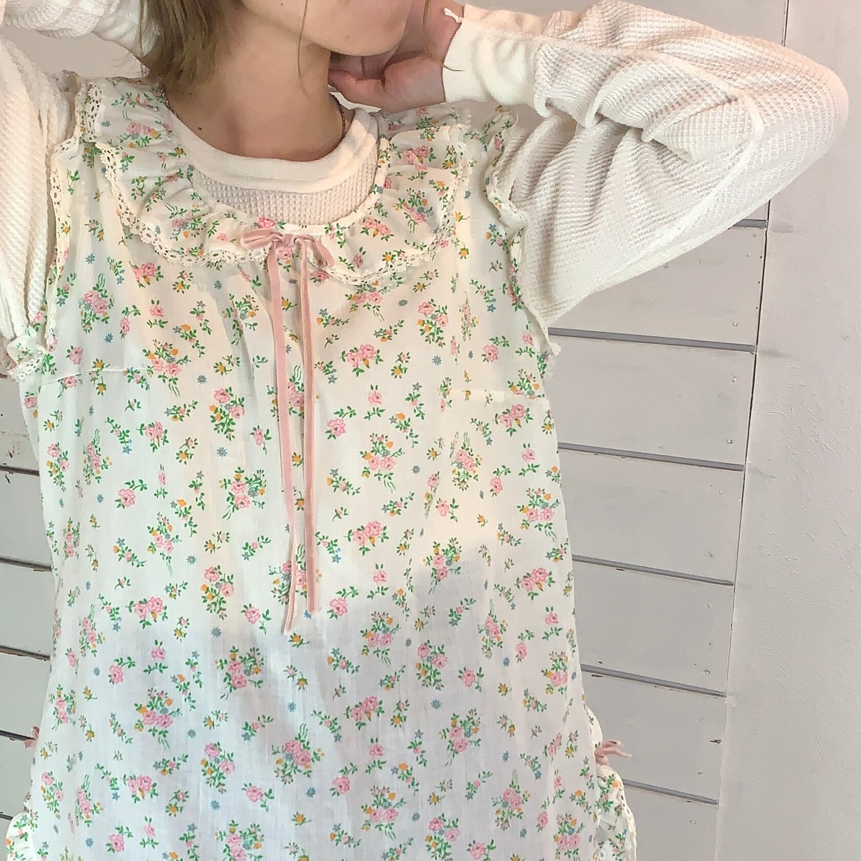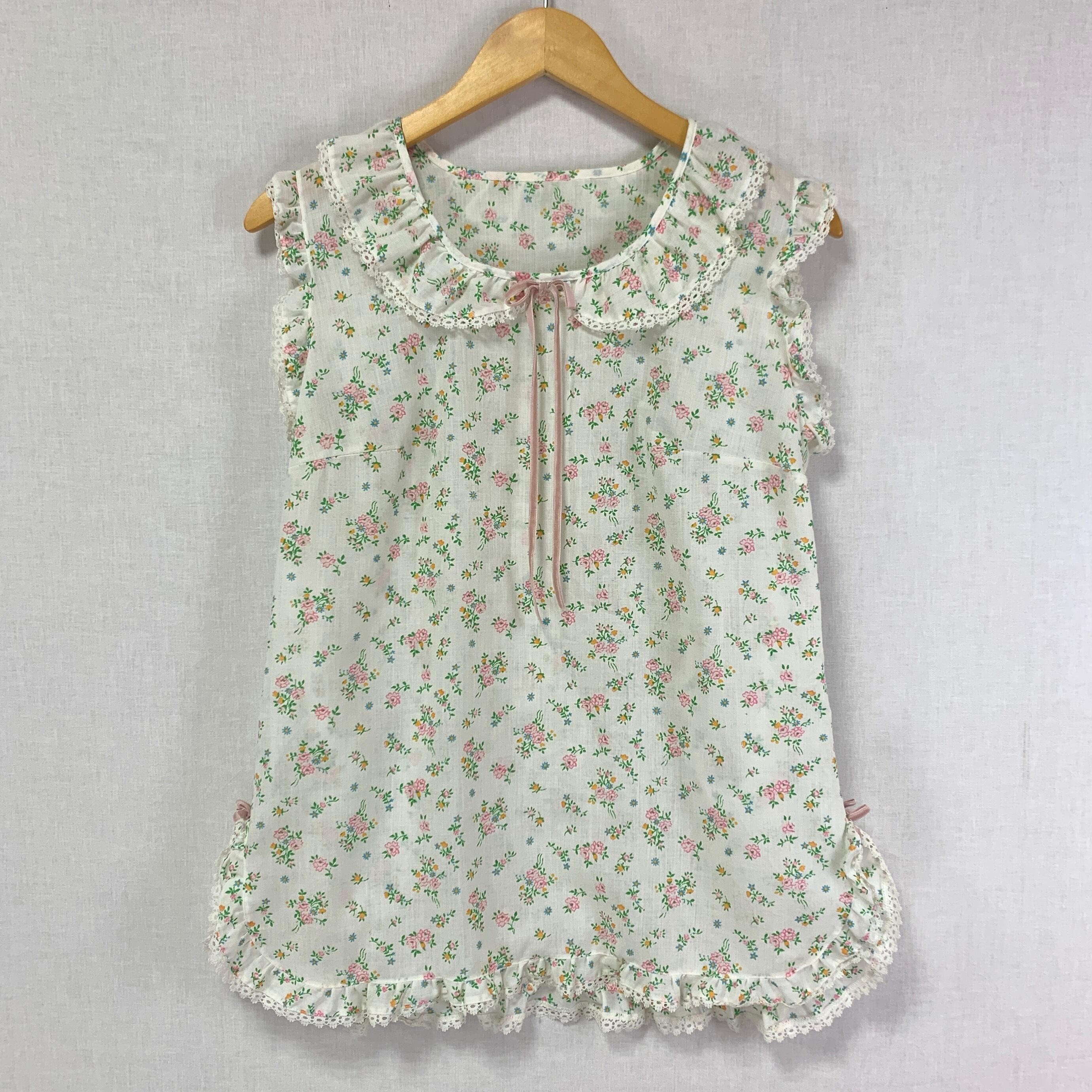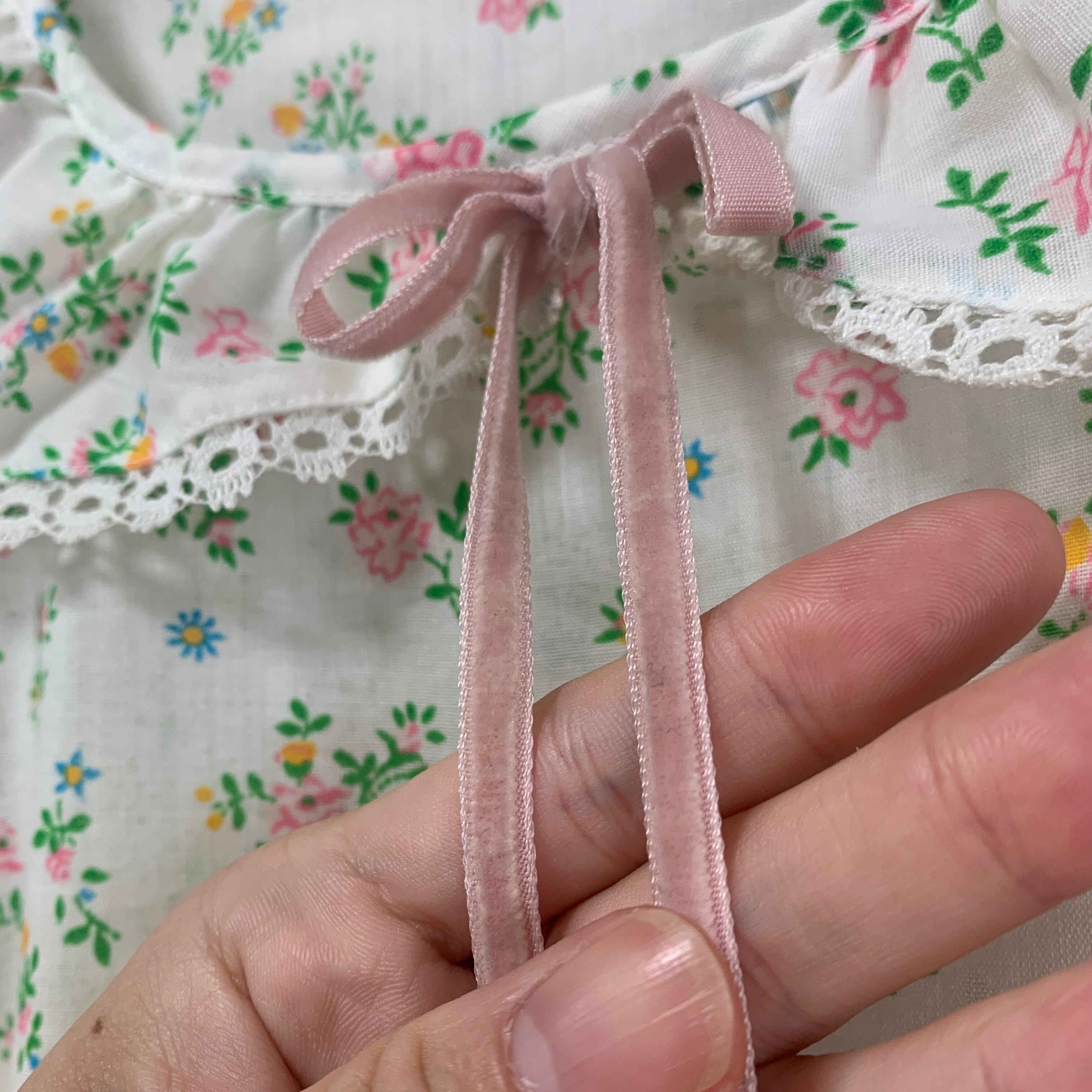 首元・袖先・裾にフリル、ポイントでベロアの細リボンがついたガーリーでロマンティックな花柄トップス