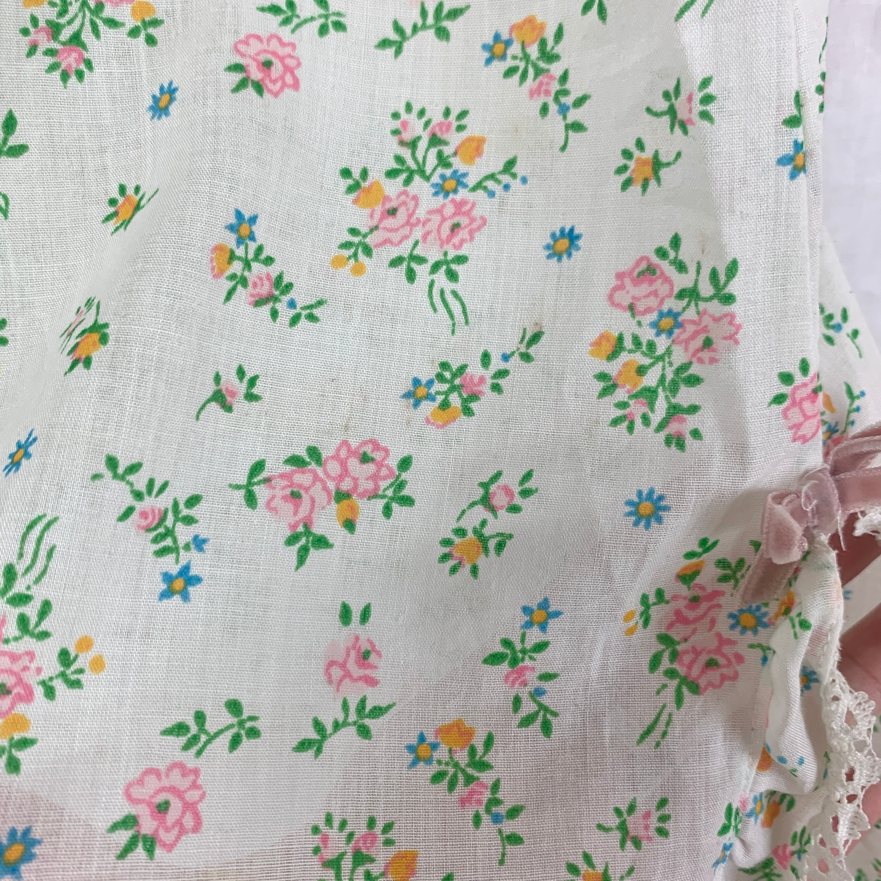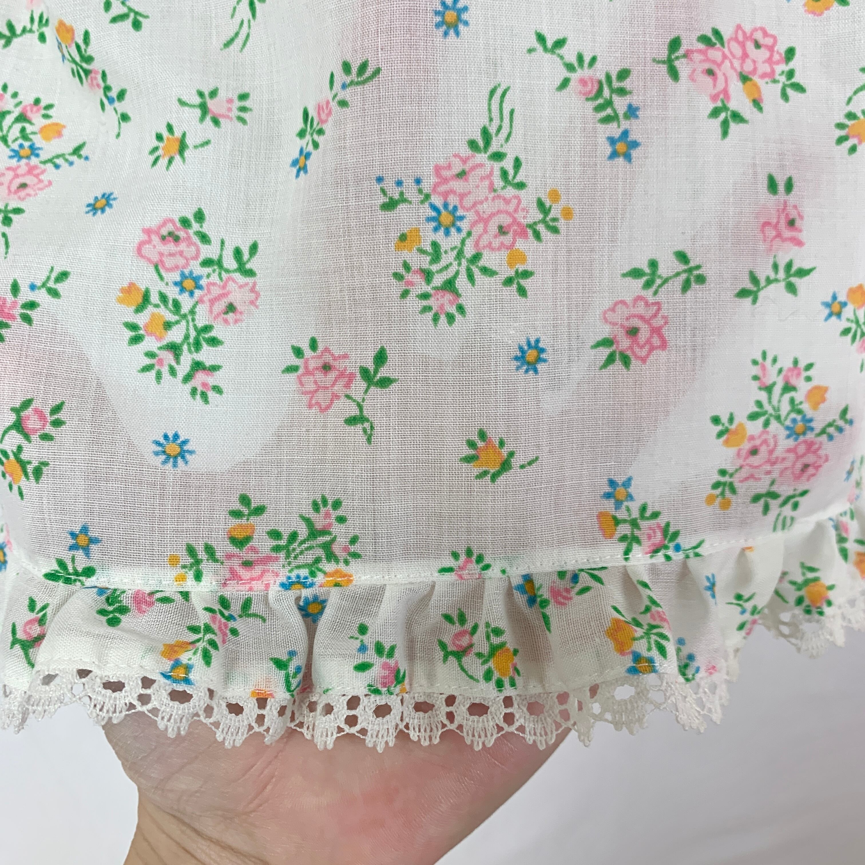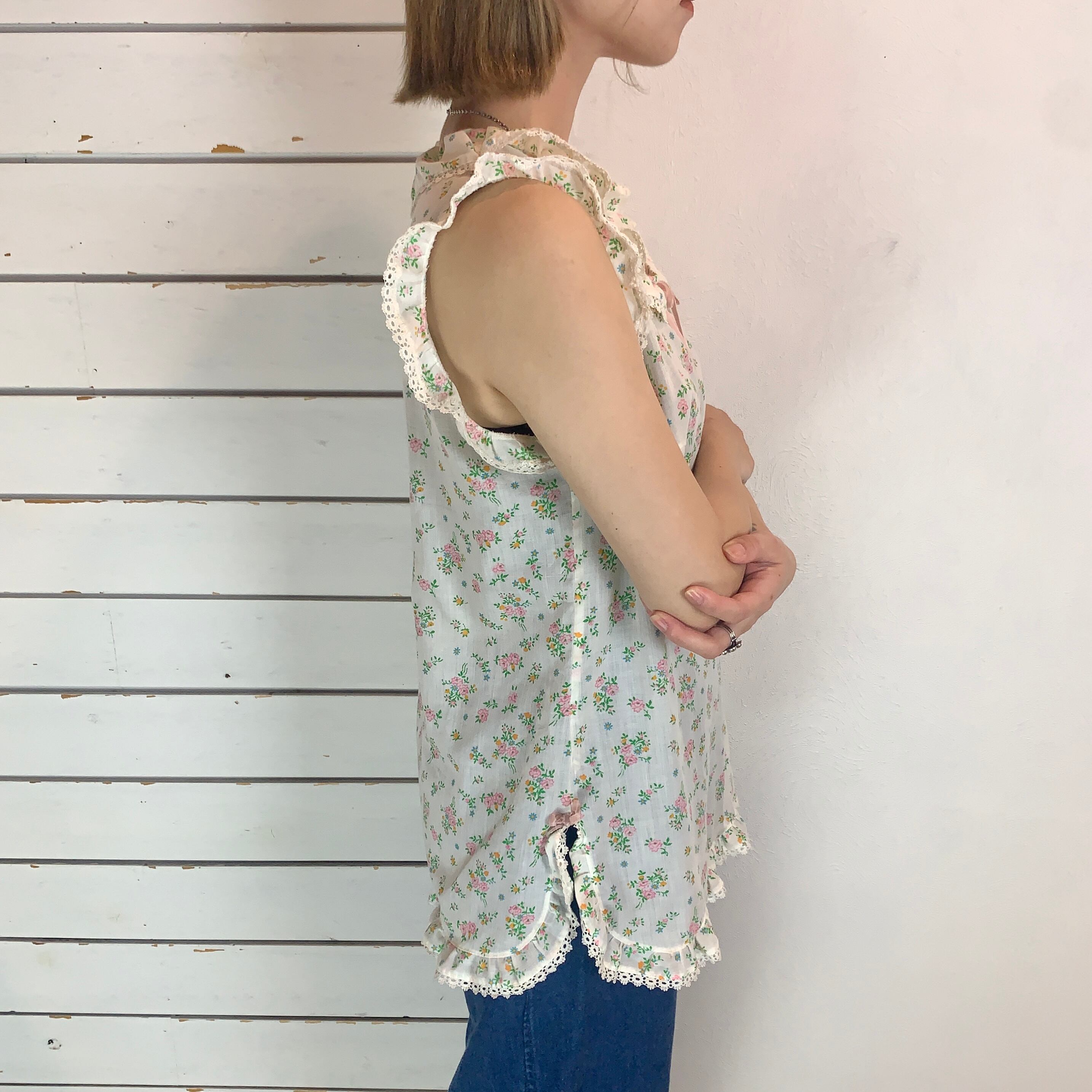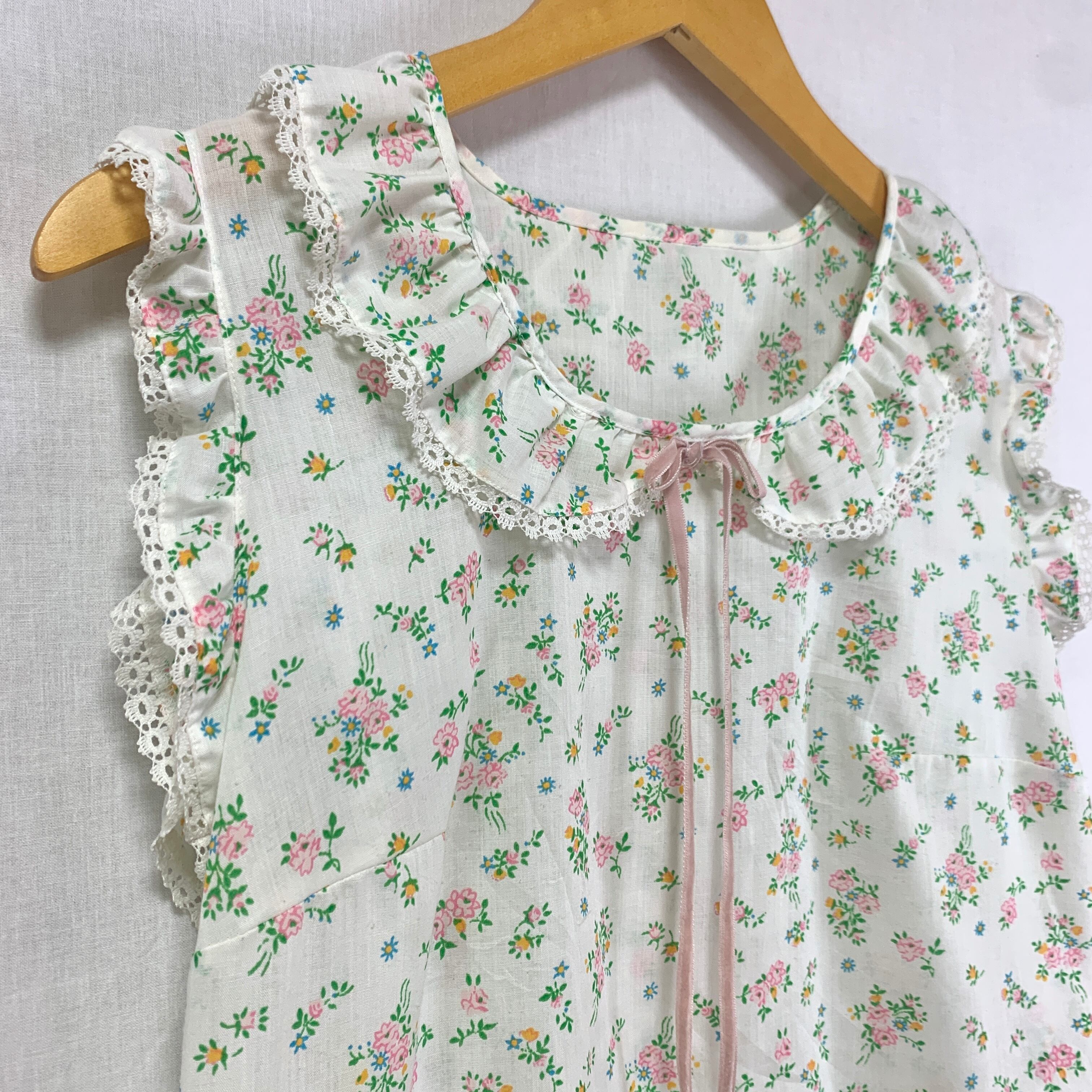 首元・袖先・裾にフリル、ポイントでベロアの細リボンがついたガーリーでロマンティックな花柄トップス