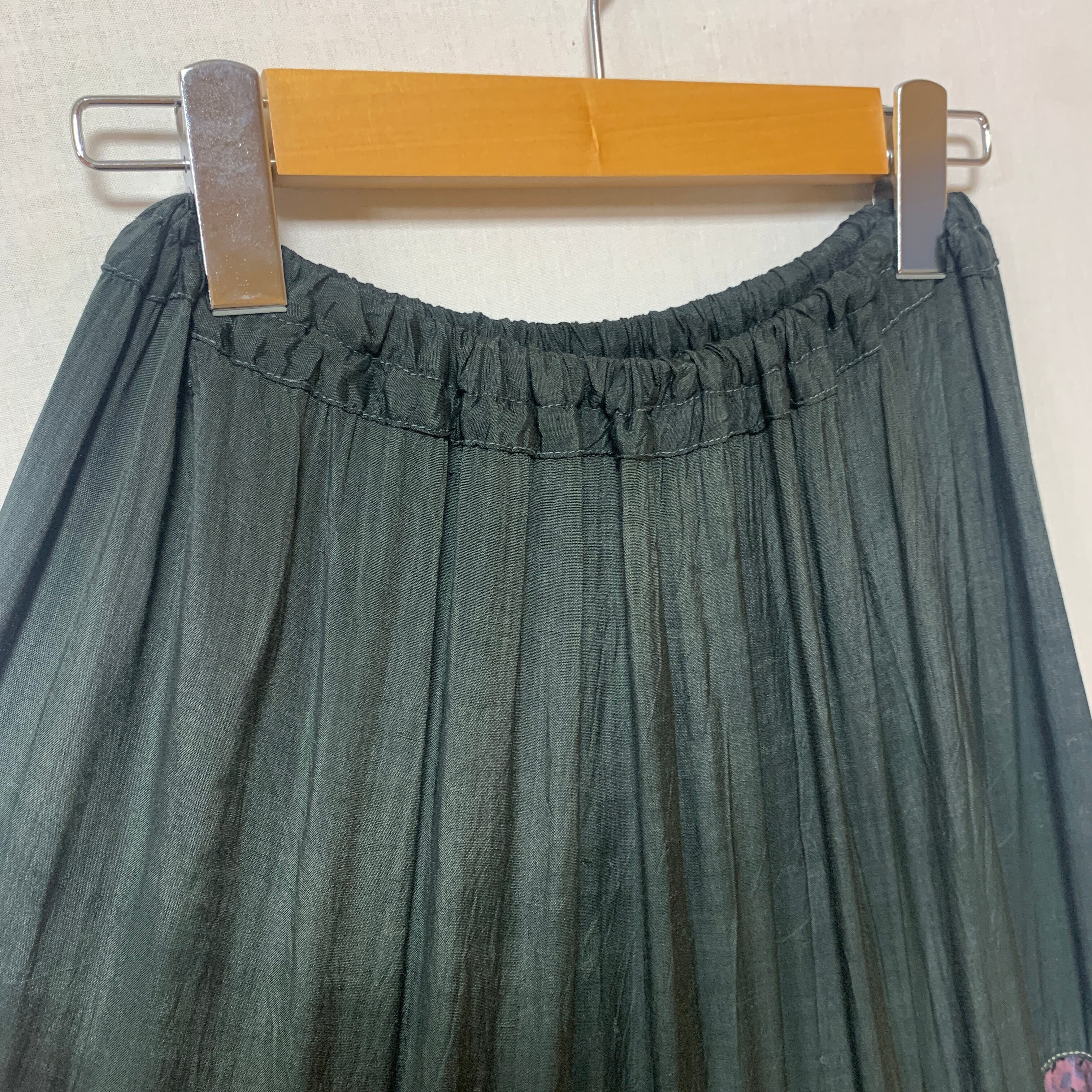 薄手ではありますがゴムウエスト&ギャザーで広がるので中ににスカートやパンツを重ねてもそれほど表にひびきません。